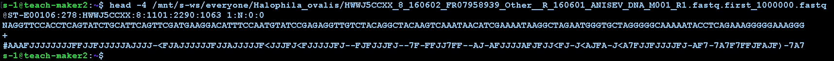 head -4 /mnt/s-ws/everyone/Halophila_ovalis/HWWJ5CCXX_8_160602_FR07958939_Other__R_160601_ANISEV_DNA_M001_R1.fastq.first_1000000.fastq